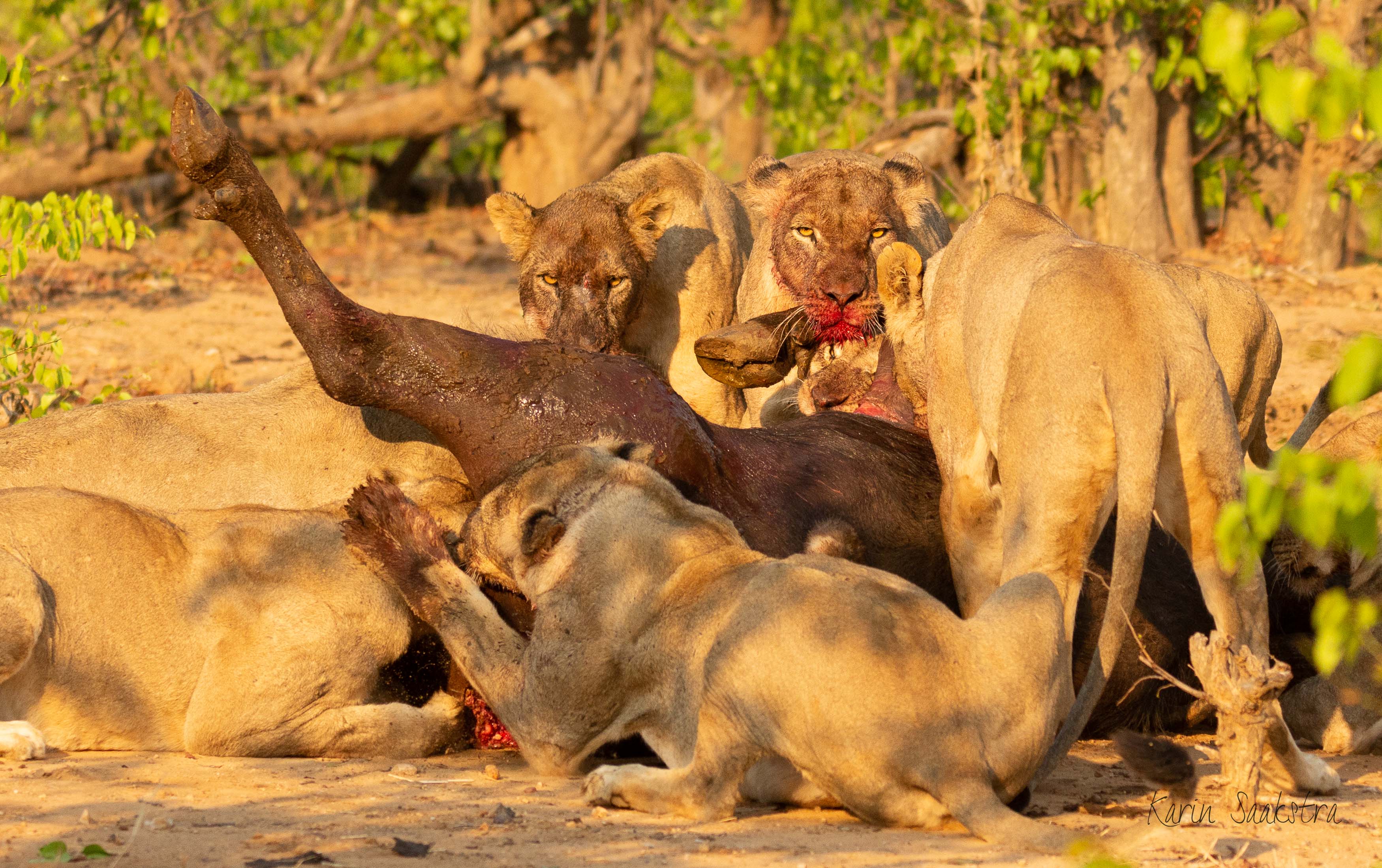 We sluiten met deze wonderlijke en gemoedelijke avond een dag of tien kamperen in het park af. Een paar dagen staan we aan de Masuma-Dam, waar we overdag profiteren van de grote rieten overkapping die schaduw biedt in de hitte van de dag. Later verhuizen we naar Ngweshla dat dieper in het zuiden van het gebied ligt. Bij beide plekken ligt een grote waterplaats waar we zoveel olifanten voorbij zien trekken dat je je afvraagt hoe het komt dat deze dieren een ‘bedreigde-soort’-status hebben. Vanuit onze hoge uitkijkpost bij Masuma hebben we goed zicht op een groep leeuwen, die loom door de warmte, in de schaduw liggen te wachten op buffels, hun favoriete maaltijd. Ze besteden nauwelijks aandacht aan de kudu’s, wrattenzwijnen, impala’s, waterbokken, nijlpaarden en krokodillen die zich in een onophoudelijke stroom , gestaag aandienen. Het duurt een dag. En dan nog een dag. In de tweede nacht verandert er iets. We horen de drie mannetjes vanaf middernacht voortdurend brullen. Alsof ze naast de auto liggen. Aan het geluid horen we dat ze zich bij het eerste ochtendlicht verplaatsen en in de verte zien we, de ogen knijpend tegen de felle opgaande zon, een lange stofwolk naderen. Buffels! Niet veel later zien we leeuwen rennen en de wolk stoppen. We horen het loeien van een dier in nood. Gegrauw en gesnauw volgt, alsof de grote katten het niet helemaal met elkaar eens zijn. Van de ranger ter plekke, mogen we met Harry het pad verderop af om de leeuwen te zoeken, die zich door de dichte begroeiing aan ons zicht onttrekken. Diep verscholen tussen de Mopani-bosjes treffen we groep. Tien leeuwen die zich tegoed doen aan het verse vlees.